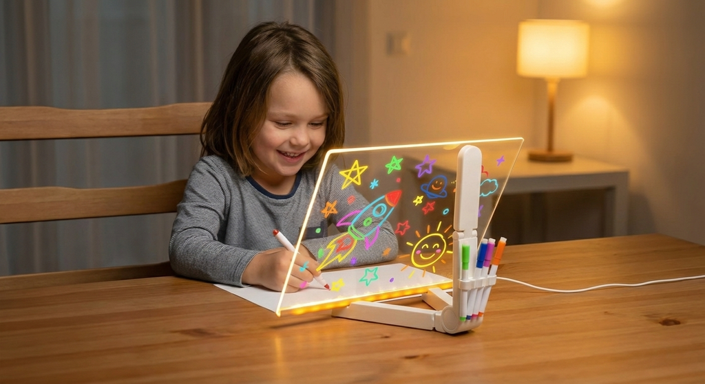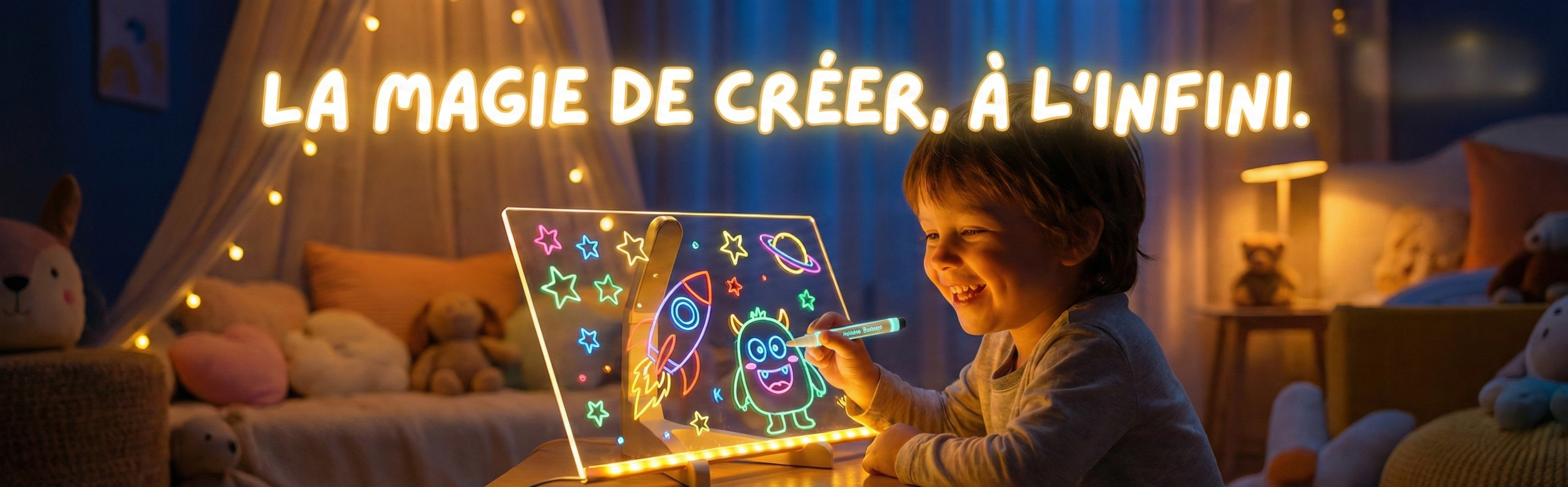 Oui, c'est le but ! L'enfant dessine, puis allume la base. Le dessin brille dans le noir. C'est une veilleuse unique et rassurante.